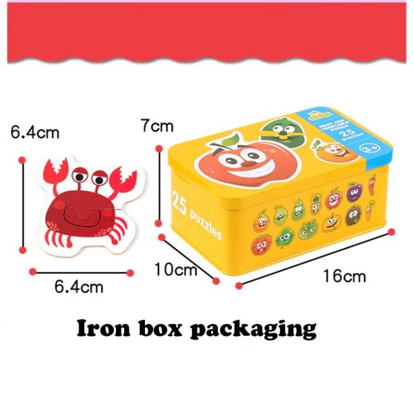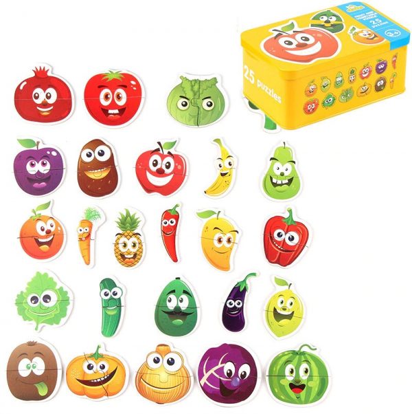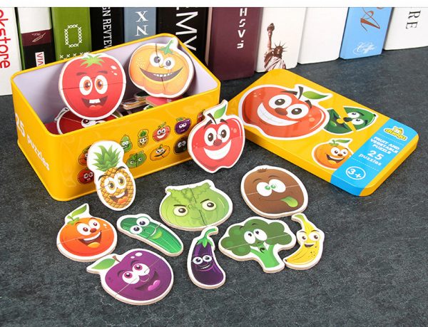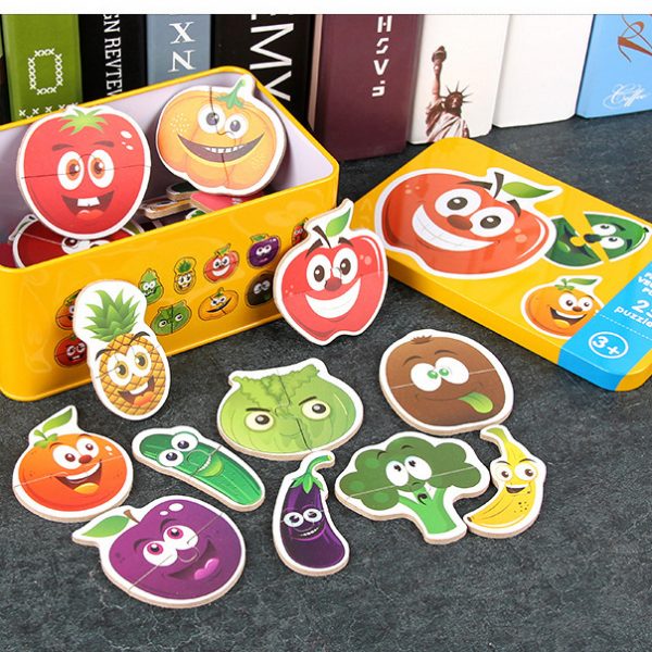 This one comes as a set in a box. It comes with 25 different fruit and vegetable patterns of different colors, which makes it easy for toddlers to put them together.