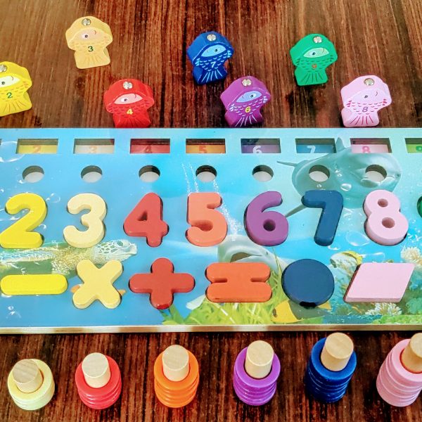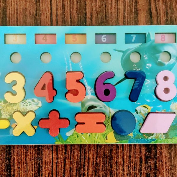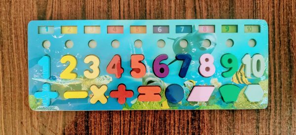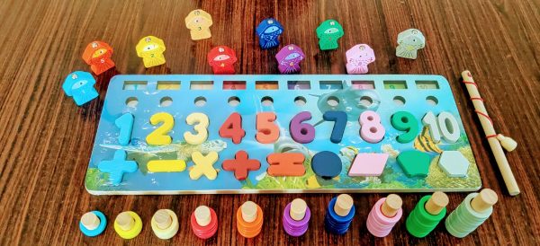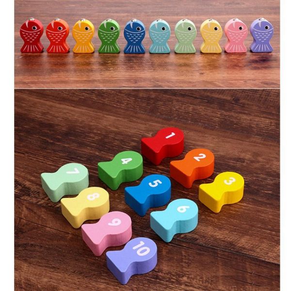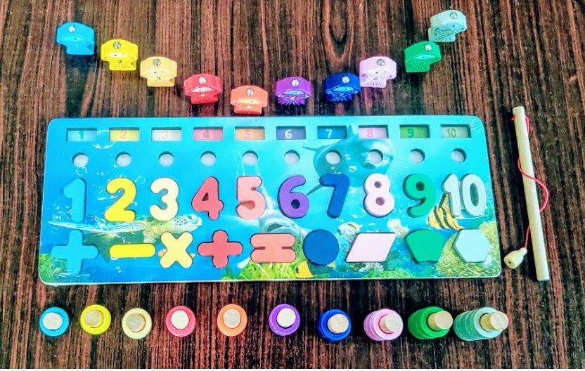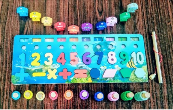 This Box comes with 10 pcs of fish, 10 pcs of Wooden Number Puzzle, 55 pcs of small circles, 1 fishing rod and 1 wooden board.