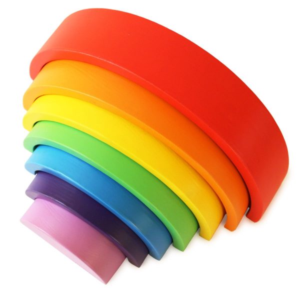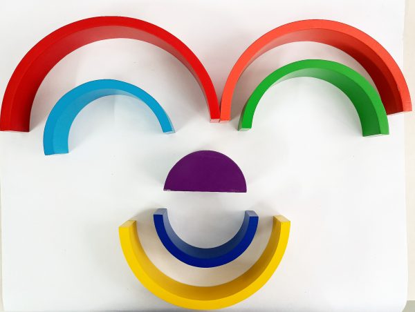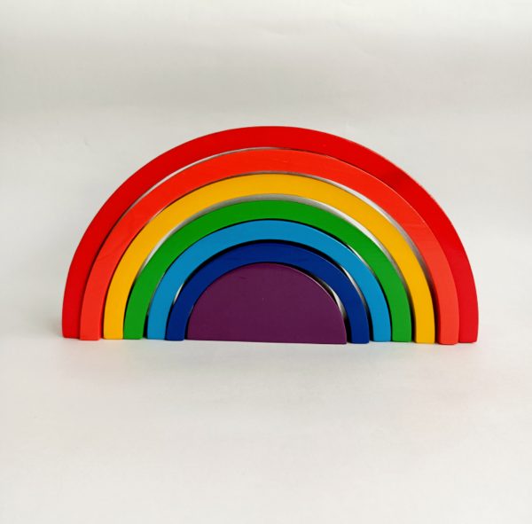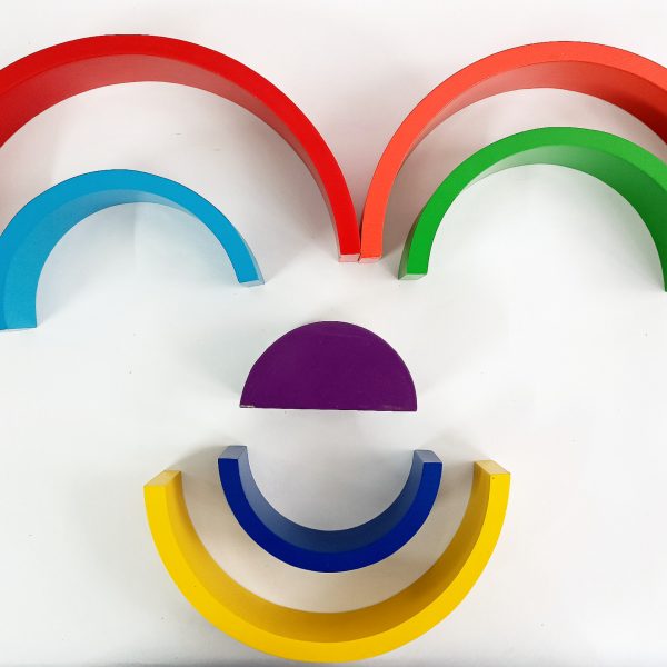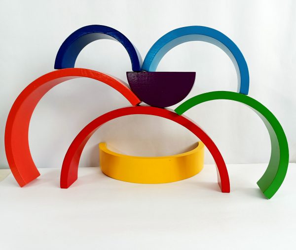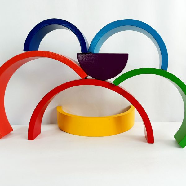A set of 7 handcrafted smooth wooden arches in bright rainbow colours. Just the right size for tiny hands to explore!