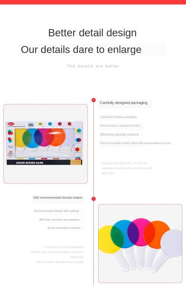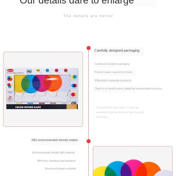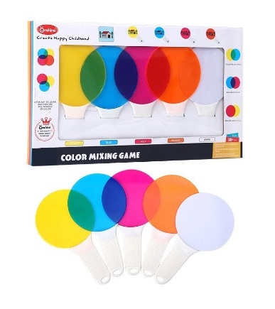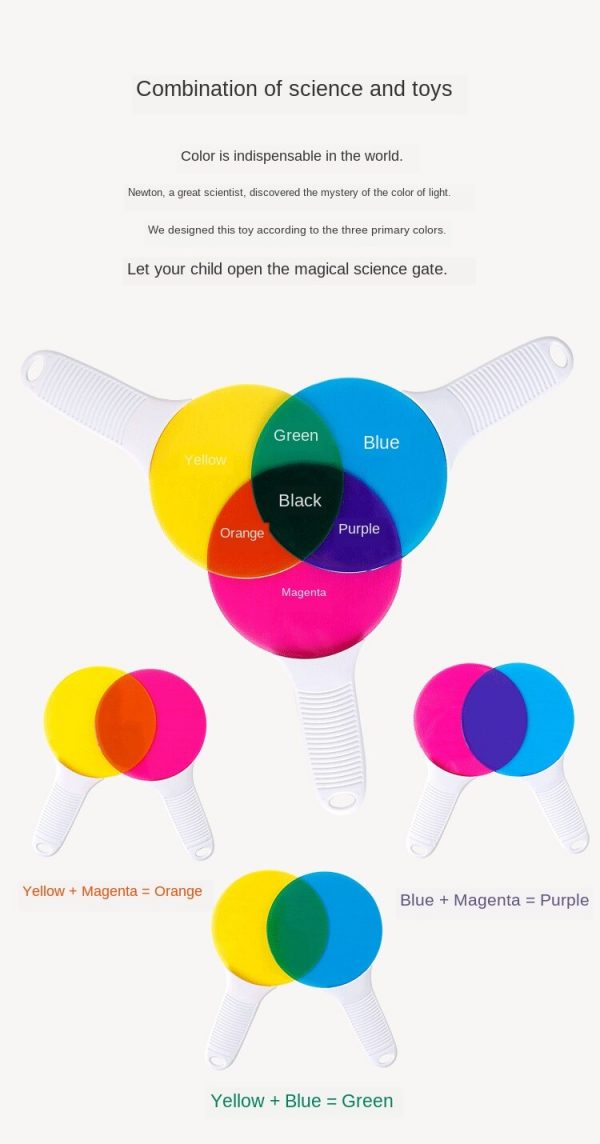 Teach kids easily the colors and the result color of mixing 2 or 3 colors together.