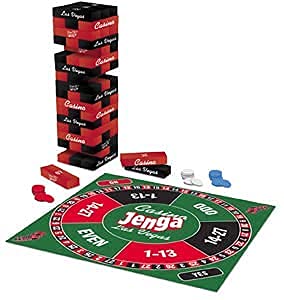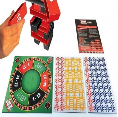 Jenga with Casino theme. Take the blocks from the tower and bet on the outcome. Contains black and red blocks, numbered as on a roulette table. Betting with money-chips follows the roulette rules.