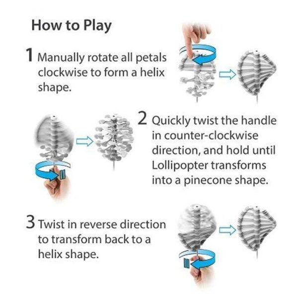 Lollipopter magically transforms from a “swirl” to a “burst” and back again in one amazingly elegant motion. To transform it, simply spin the handle and watch the magic unfold. To change it back, just spin it the other way. Intuitive, relaxing, fun…and addictive! From an interactive kinetic toy in your hand to a stylish sculpture on the display stand, Lollipopter can be played with as a toy, employed as a stress reliever, displayed as a desktop accessory, or used in home decor. It’s a versatile accessory for your creative life.