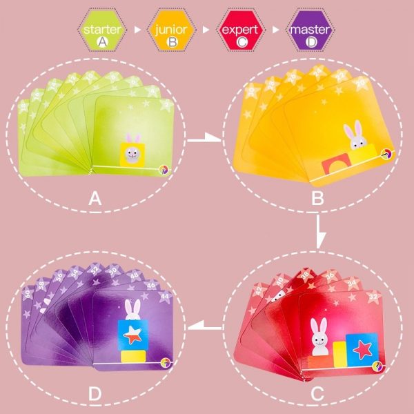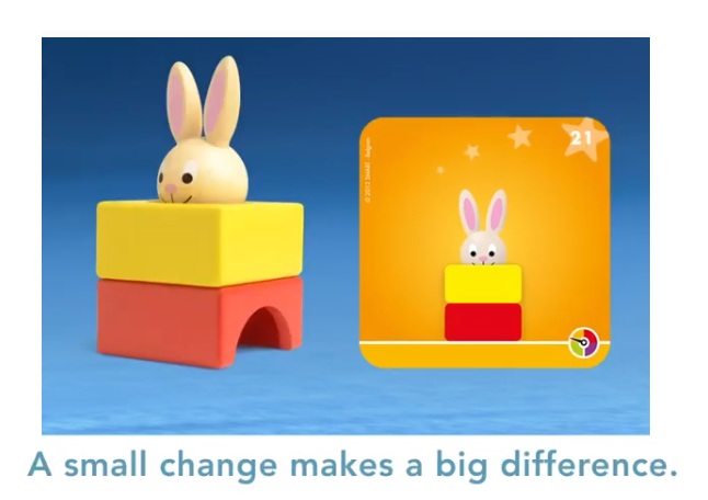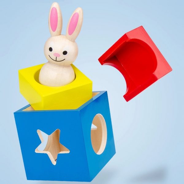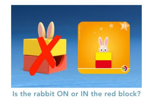 Pull a rabbit out of the box! Is the rabbit looking through the round hole or through the star-shaped one? Is it standing on top of the yellow, the red, or the blue block? Some challenges may look very similar, yet the solution can be completely different depending on how far the ears of the rabbit stick out. Bunny Boo Magic Box is a fantastic and fun introduction to concepts such as above/below, inside/outside, visible/hidden, etc.
