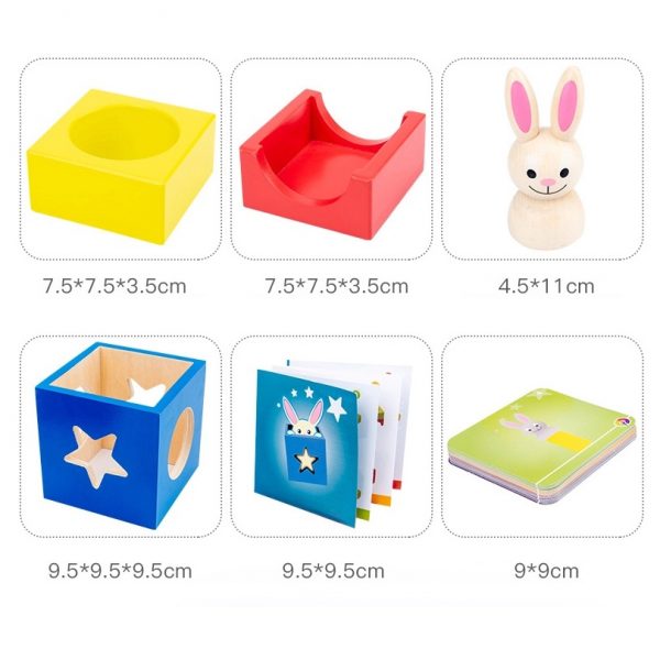 Wooden rabbit, 3 wooden blocks, challenge cards, leaflet with solutions