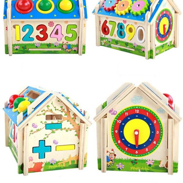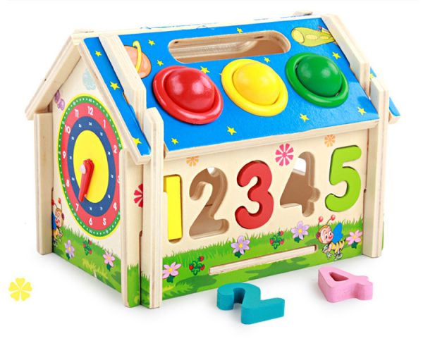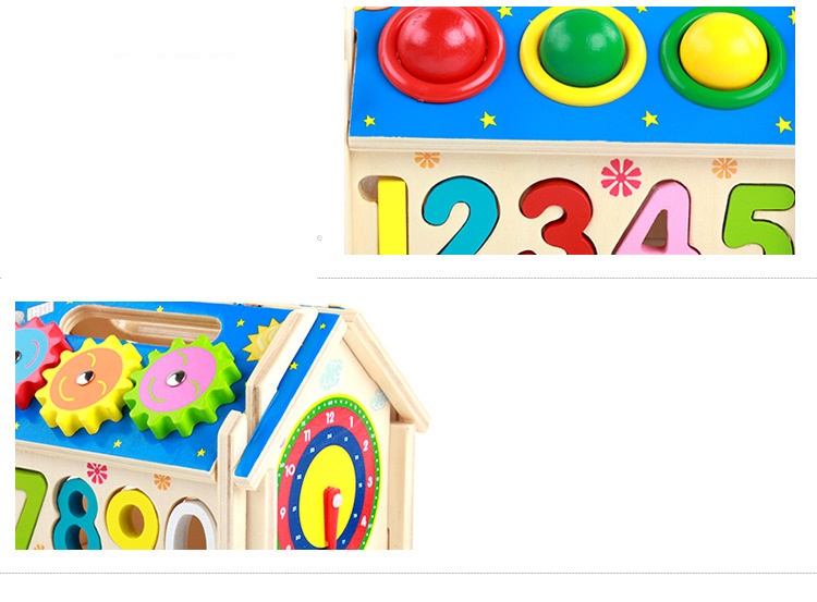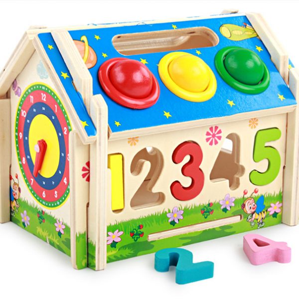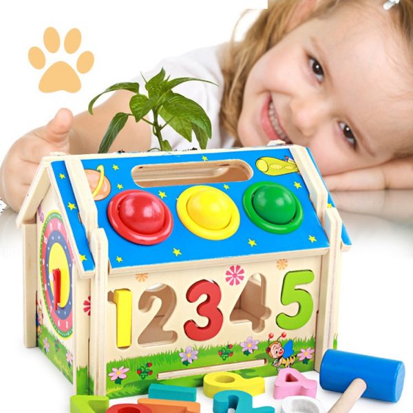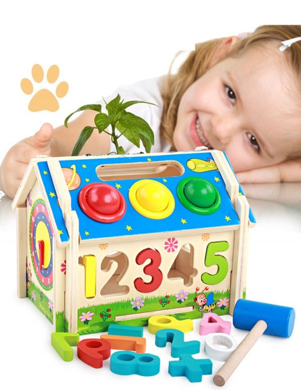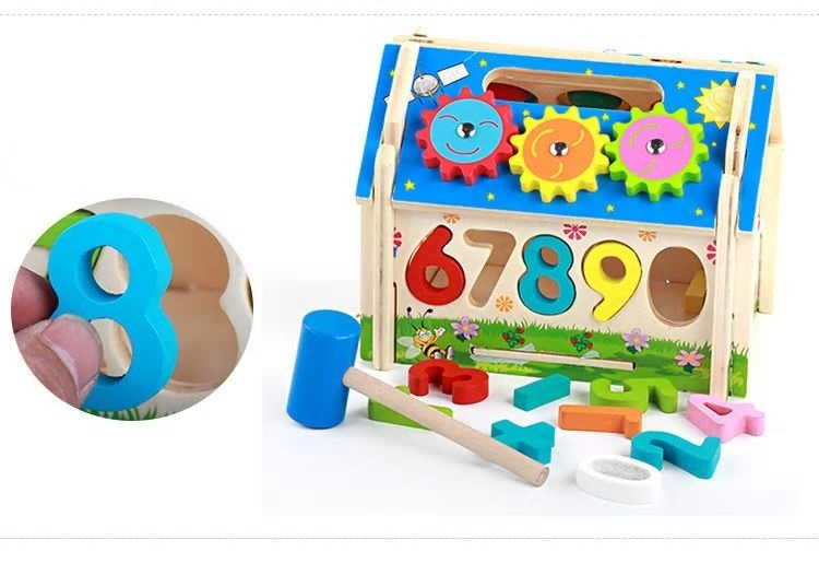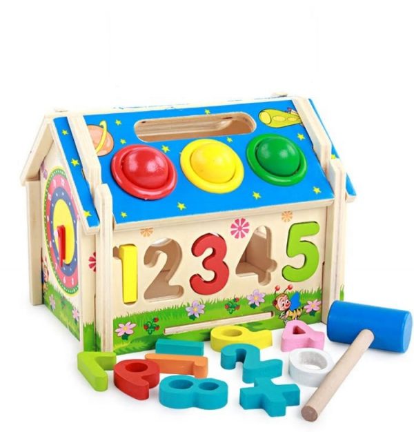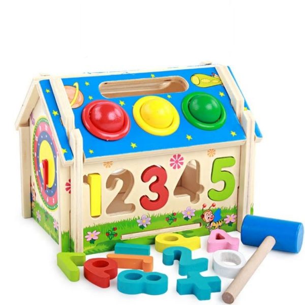 Creative wooden house toy, shape sorter wisdom house with pounding bench ball and hammer for kids,educational digital number, time clock, shapes and symbol cognition wisdom house for kids and toddlers!!!