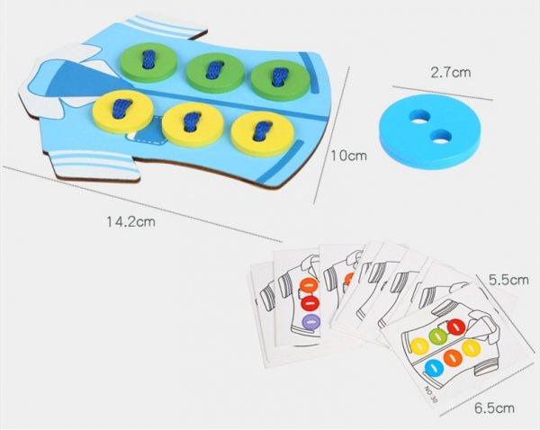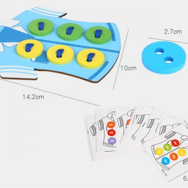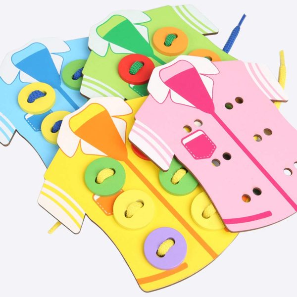 With thread, buttons, and a wooden sewing board your kids can be a real little clothes designer. Place the button near the wooden sewing board and then insert the thread inside the holes of the button to attach the button with the wooden sewing board.